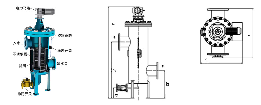 | 型號(hào) | 管徑 | 出入水口 | J | J1 | J2 | J3 | Y | K | 過(guò)濾面積 | 處理水量 | 重量 |