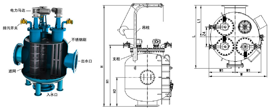 | 型號(hào) | 管徑 | 出入水口 | L | L1 | W | W1 | H | H1 | H2 | Z4 | 流量 | 過(guò)濾面積 | 重量 |